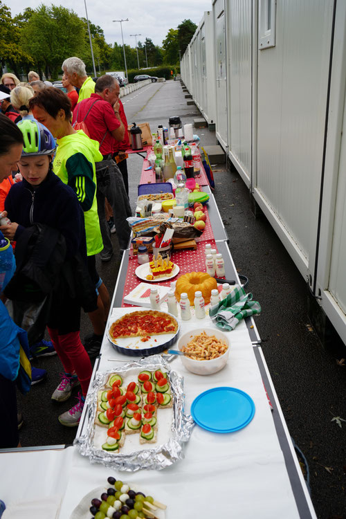 Der Regen hatte ein Einsehen und zog sich kurz vor dem Start zurück. Und nach dem Lauf gab es wie immer ein derart reichliches Buffett, dass die ca. 60 Anwesenden dieses nicht bewältigen konnten.Auf dem Foto ist nicht das komplette Angebot zu sehen.